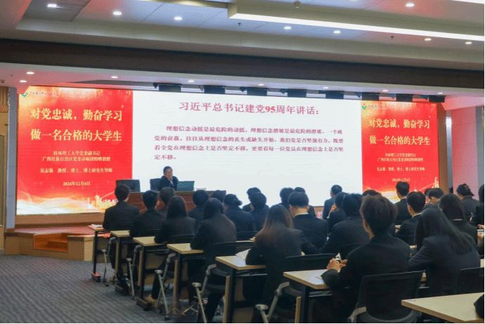 广西建院12月7日讯(团委 文/宋丽 谢湘宜 图/陈乃锦 李强)12月6日下午,桂林理工大学党委副书记吴志强教授在四教二楼报告厅为首页“青马工程”骨干班学员讲授了一场主题为《对党忠诚,勤奋学习,做一名合格的大学生》的精彩讲座,学校党委书记刘晓红出席并主持讲座。党委学生工作部部长周舟,马克思主义学院党总支书记邱岚,团委书记曾小贵,以及校级“青马工程”骨干班全体学员参加讲座。