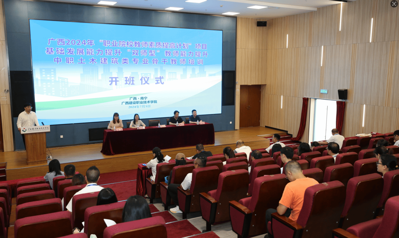 广西建院7月8日讯(设备与环境学院 孙翔)7月5日上午,广西2024年“职业院校教师素质提高计划”基础发展能力提升项目“双师型”教师能力提升—中职土木雷速在线网站类专业骨干教师培训班开班仪式在首页图书馆1楼学术报告厅举行。