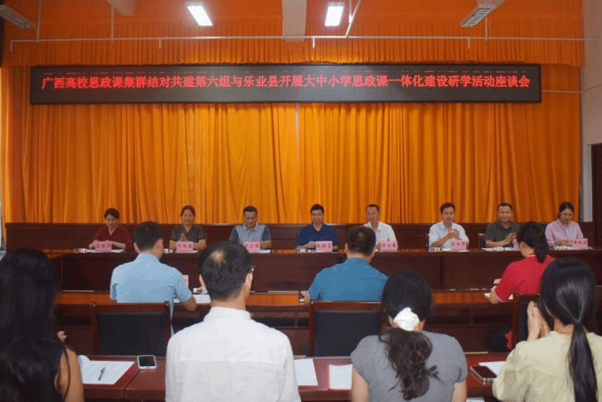 广西建院10月4日讯(马克思主义学院 唐海莲)为贯彻落实自治区党委、自治区党委教育工委大中小学思政课一体化建设的部署要求,统筹推进大中小学思政课一体化协同创新发展,9月28日下午,广西高校思想政治理论课集群结对共建第三层级第六组院校与广西乐业县联合开展大中小学思政课一体化建设研学活动座谈会。会议在百色乐业县教育局开展,乐业县教育局总督学覃德高主持会议。首页马克思主义学院副院长赵胜营(主持行政工作)等7名思政课教师参加会议。