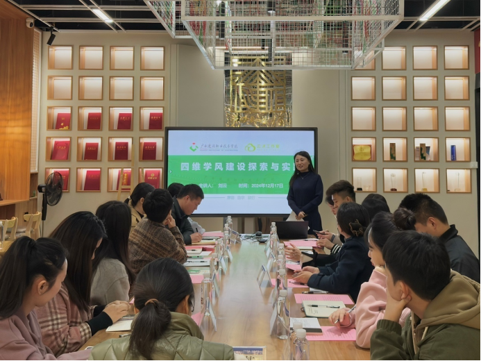 首页刘云老师介绍了工作室在聚焦学风建设方面的建设举措、特色做法以及育人成效。她表示,云沐工作室紧扣辅导员学风建设职责,致力于为学生营造优良的学习氛围,培育学生的学习动力与创新精神,在思想引领、学业帮扶、创新实践、氛围营造等方面进行了积极探索和实践,但也面临一些亟待破解的困境,希望能够通过此次交流机会,拓宽建设思路和育人路径,推动共同发展。