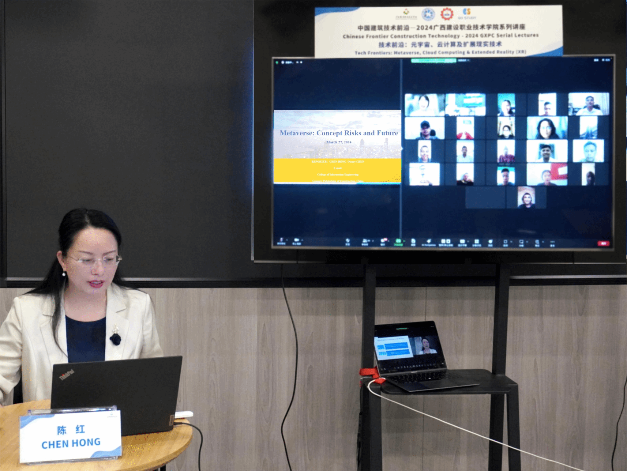 陈红博士以《元宇宙:概念、风险和未来》为题,从元宇宙的发展历程、国内外元宇宙的现状分析、元宇宙的风险、元宇宙的未来多个重要维度切入元宇宙这一新兴领域,介绍了关键的技术发展节点,如互联网、虚拟现实(VR)、增强现实(AR)、人工智能(AI)、数据孪生等技术的融合与进步,以及这些技术如何共同构建起支撑元宇宙的基础架构。通过运用实际案例和视频演示为学生呈现元宇宙技术在实体经济中的实际应用与价值。