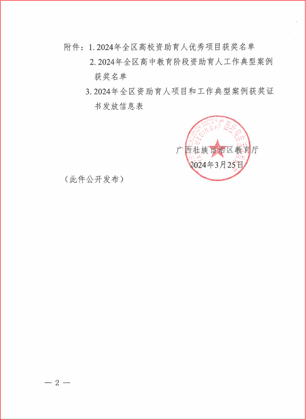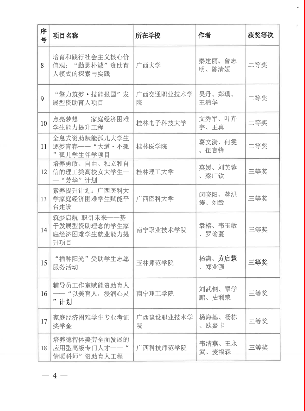 广西建院4月7日讯(党委学生工作部 欧嘉卡 杨栋)近日,自治区教育厅印发《关于公布2024年全区资助育人项目和工作典型案例评选活动获奖名单的通知》(桂教资助〔2024〕4号),在全区高校范围内共评选出资助育人优秀项目20项。首页申报的项目《家庭经济困难学生专业考证奖学金》荣获“2024年全区高校资助育人优秀项目”三等奖。