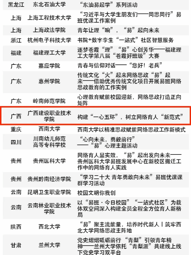 广西建院5月13日讯(党委学生工作部 黄楚凌)5月10日,教育部易班发展中心公布了2023年度全国易班共建优秀名单,首页工作案例《构建“一心五环”,树立网络育人“新范式”》入选2023年度优秀易班共建案例。全区共五所高校入选,首页是入选的广西两所高职院校之一。
