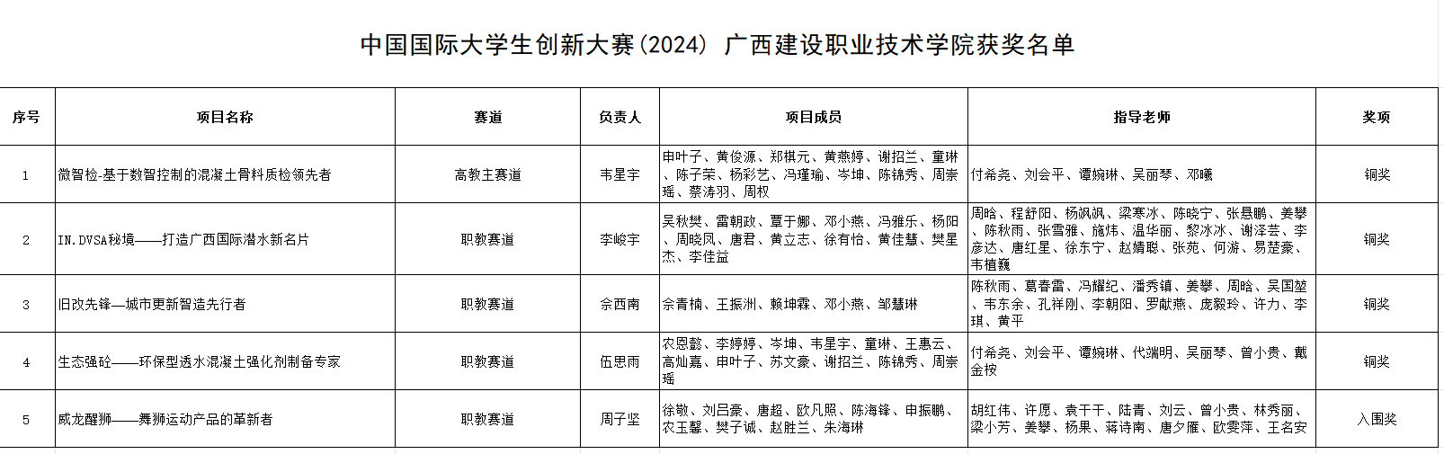 广西建院4月14日讯(招生就业处 何昕婕)日前,教育部公布中国国际大学生创新大赛(2024)全国总决赛获奖名单。首页获高教主赛道铜奖1项,职教赛道铜奖3项、入围奖1项。至此,首页已连续四年在该赛事获得国家级奖项,累计获得1金1银8铜2入围奖。