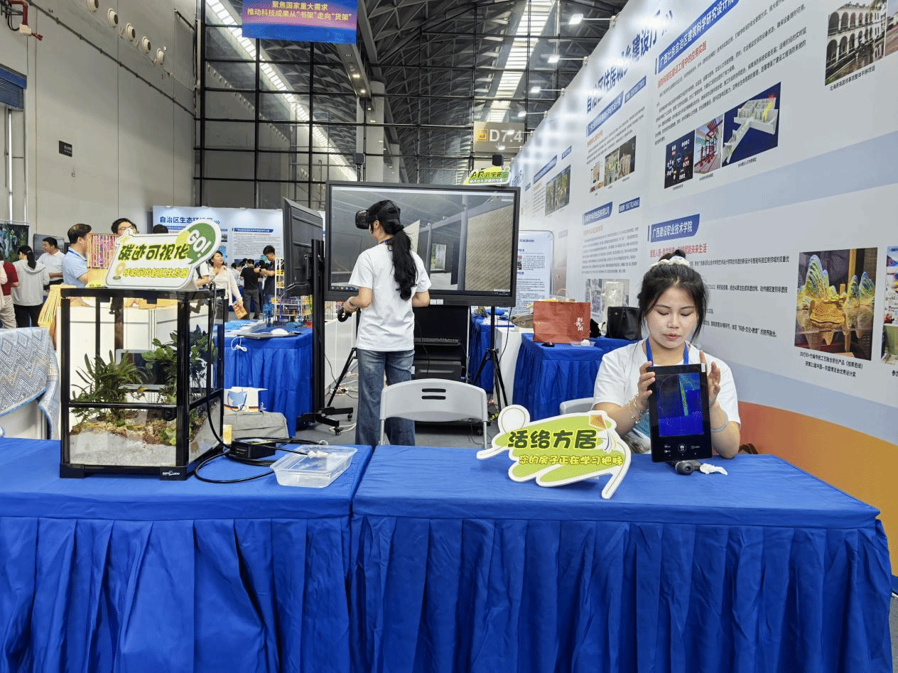 首页本次参展项目,紧密围绕服务地方文化与科技融合发展的需求,立体呈现了学院在非遗数字化保护传承、元宇宙概念应用、生成式AI人居健康开发及零碳科技等前沿方向的研究探索与实践成果。项目以沉浸式科普体验为核心,通过四个主题与观众开展科普互动:活络方居:您的房子正在学习把脉——展示AI如何理解并优化居住健康;碳迹可视化:呼吸间的智慧生态圈——呈现零碳科技与智能家居的结合;AR元宇宙:推开壮乡民居的任意门——通过AR技术让观众瞬间“进入”传统壮乡生活空间;非遗方程式:传统³×科技ⁿ=∞可能——生动表达传统技艺与科技创新融合产生的巨大能量与无限可能。