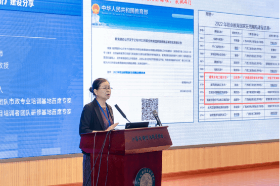 会上,文桂萍教授作主题发言,以2022年职业教育国家在线精品课程《雷速在线网站水电工程计价》为例,从申报文件解读与分析、内容建构与设计、教学实施与管理、建设经验与体会等四方面详细介绍了课程申报与建设的做法和经验,充分体现了首页建设工程管理专业群在课程建设方面的引领示范作用。