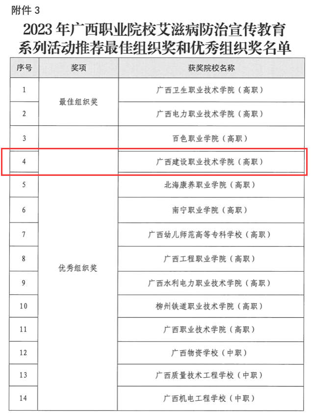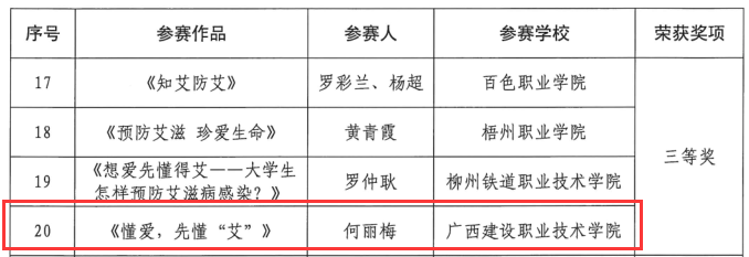 广西建院7月14日讯(党委学生工作部 周晓卉)近日,在自治区卫生健康委、自治区教育厅举办的广西职业院校艾滋病防治宣传教育系列活动中,首页荣获优秀组织奖。同时,首页何丽梅老师在“我是防艾卫士”微课比赛中荣获三等奖;首页老师指导学生作品在“你我来防艾”短视频征集大赛中分别荣获三等奖1项、优秀奖9项。