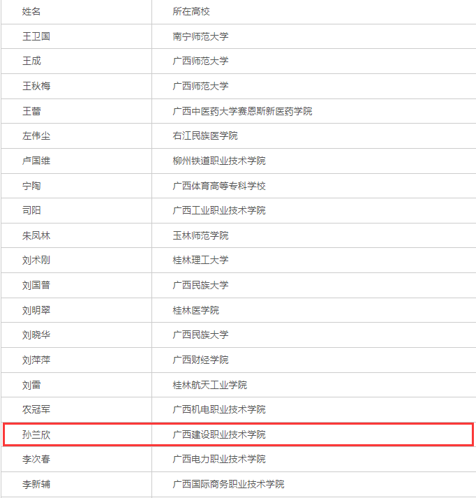 广西建院8月5日讯(马克思主义学院 曹桃)近日,自治区党委教育工委、自治区教育厅公布“广西高校思想政治教育卓越教师”支持计划第一期支持对象名单,首页马克思主义学院孙兰欣教授、徐飞副教授被认定为“广西高校思想政治教育卓越教师”骨干教师(思想政治理论课专任教师类)。