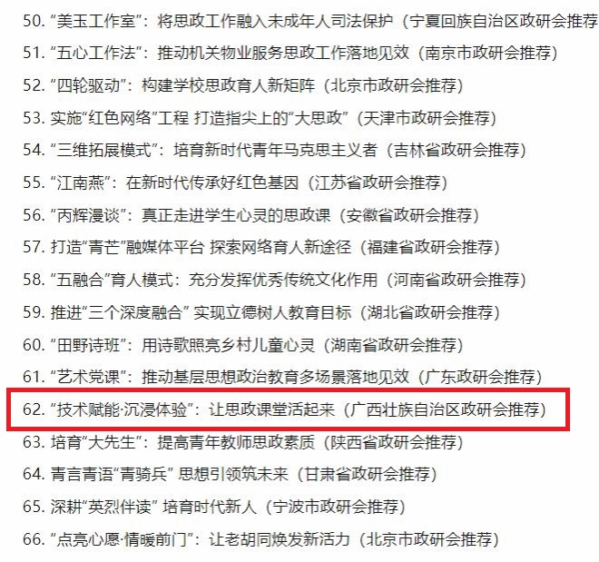 广西建院8月28日讯(马克思主义学院 李生) 近日,中国政研会公布了2023年度基层思想政治工作优秀案例名单,由各省(区、市)和全国性行业(系统)政研会推荐的80个案例入选。其中,由广西壮族自治区政研会推荐,首页马克思主义学院李生副院长报送的《“技术赋能·沉浸体验”:让思政课堂活起来》案例入选。