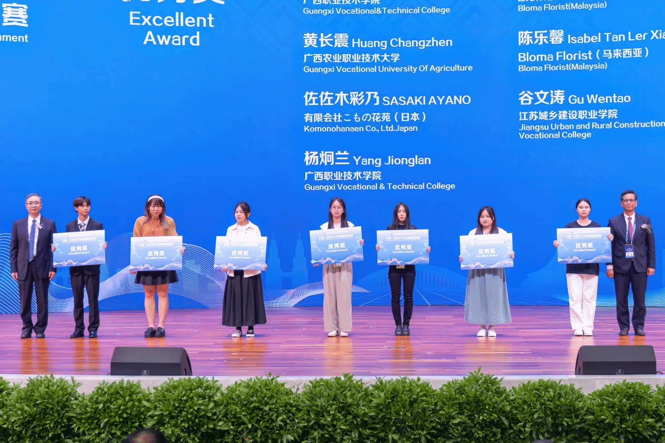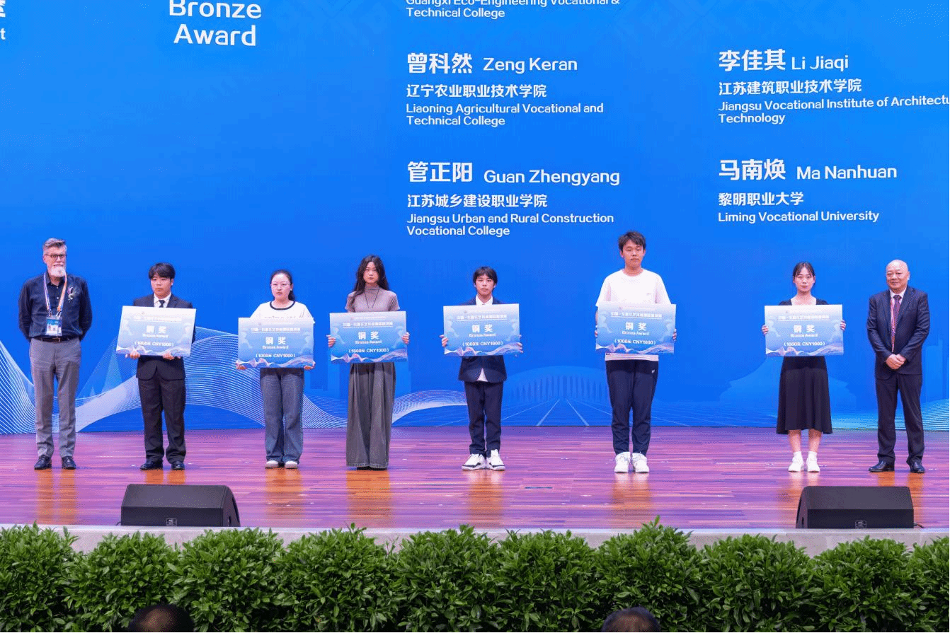 大赛组委会、专家组、裁判组和工作人员,以及来自国内外13个参赛队的19名参赛选手,广西建院师生代表参加了颁奖仪式。