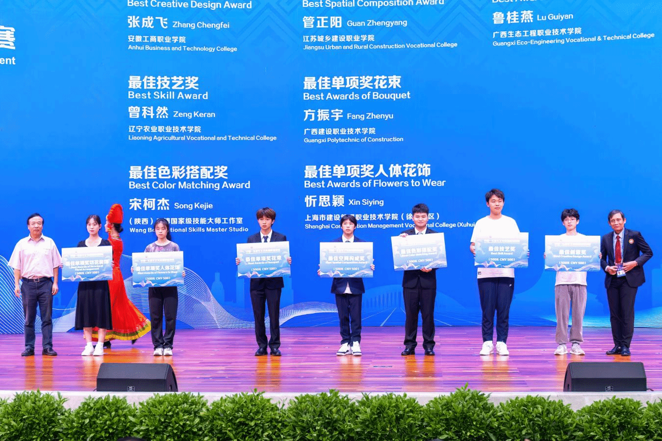 在为期两天的比赛中,选手们沉着冷静,根据赛事要求创作完成了三个模块的花艺作品,将创意、技艺、色彩搭配和空间构成完美结合,展现出了扎实的专业功底、出色的技能水平和优秀的文化素养,为大家献上了一场精彩的“花艺对决”,给“绿城”南宁和广西建院带来了一场花艺盛宴。裁判组坚持“公平、公正、公开”的原则,严格执裁、认真负责,圆满完成了赛事的执裁工作,保证了赛事的成功举办。经过激烈的角逐和技能比拼,共评选出金奖2项、银奖4项、铜奖6项,优秀奖和单项奖共14项,2名教师获优秀指导教师。与会领导为获奖选手、优秀指导教师颁奖。