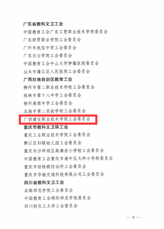 广西建院9月18日讯(工会 陆康)近日,中国教科文卫体工会全国委员会印发《关于确认全国教科文卫体系统模范职工之家、模范职工小家的通知》(教科文卫体工发﹝2023﹞14号),首页工会被中国教科文卫体工会全国委员会确认为全国教科文卫体系统模范职工之家。这是全面评价工会工作的综合奖项,是首页工会有史以来被授予的最高荣誉,全区只有5所学校获此殊荣,首页是其中唯一一所高校。
