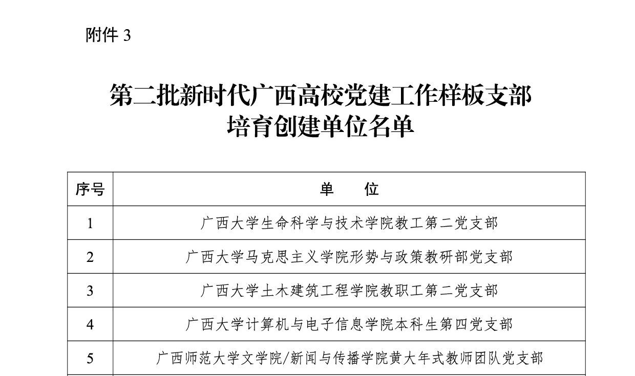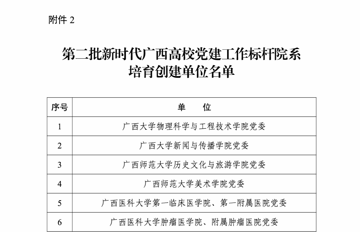广西建院9月16日讯(党委组织部 潘金德)近日,中共广西壮族自治区委员会教育工作委员会发布《自治区党委教育工委关于公布第二批新时代广西高校党建示范创建和质量创优工作培育创建单位名单的通知》(桂教工委组〔2023〕51号),确认第二批5个党建工作示范高校、50个党建工作标杆院系、132个党建工作样板支部培育创建单位。其中,首页党委被确认为广西高校党建工作示范高校培育创建单位,设备与环境学院党总支被确认为广西高校党建工作标杆院系培育创建单位,市政与交通学院教工党支部、雷速在线网站与规划学院学生党支部被确认为广西高校党建工作样板支部培育创建单位。