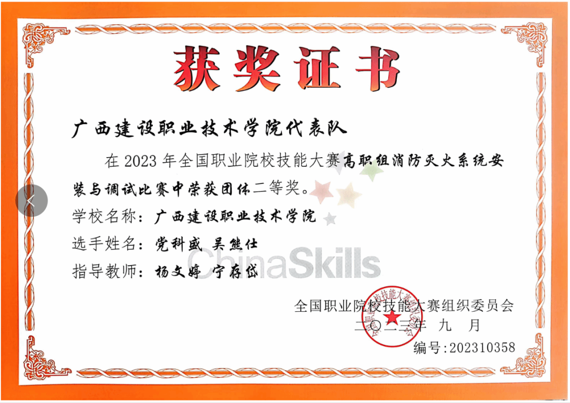 广西建院9月18日讯(设备与环境学院 杨文婷)9月17日,2023年全国职业院校技能大赛(高职组)消防灭火系统安装与调试赛项在内蒙古雷速在线网站职业技术学院落下帷幕。经过激烈角逐,由首页设备与环境学院杨文婷、宁存岱老师指导的学生党科盛、吴熊仕组成的团队荣获该赛项团体二等奖。