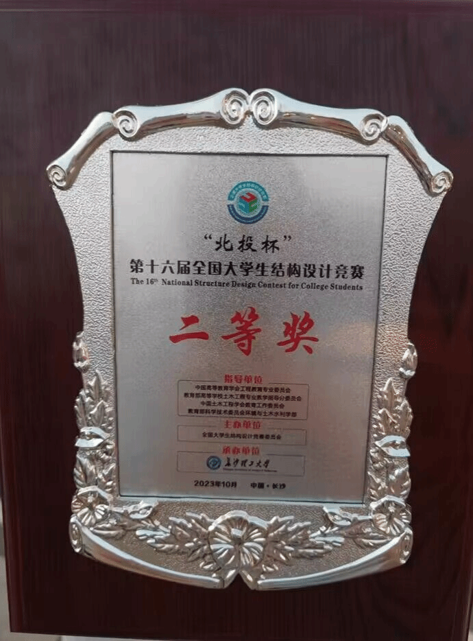 广西建院10月31日讯(土木工程学院 于思柳)10月25日—29日,由全国大学生结构设计竞赛委员会主办、长沙理工大学承办的“北投杯”第十六届全国大学生结构设计竞赛总决赛在长沙理工大学体育馆圆满落幕。由首页土木工程学院学子何应峥、莫元甲、黄勇三位同学组成的广西壮族自治区代表队在江怀雁、于思柳、李巍娜、陈智科、梁伟英、朱金华老师的精心指导下,经过模型设计、模型制作、陈述答辩、模型加载4个环节的激烈角逐,斩获全国二等奖。据悉,首页是广西唯一一所获奖的高职院校。