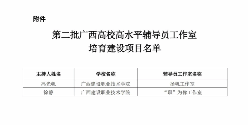 广西建院8月1日讯(“职”为你工作室 扬帆工作室)近日,自治区教育厅公布第二批广西高校高水平辅导员工作室培育建设项目名单,首页设备与环境学院辅导员徐静主持的“职”为你工作室和土木工程学院辅导员冯光帆主持的扬帆工作室双双入选。