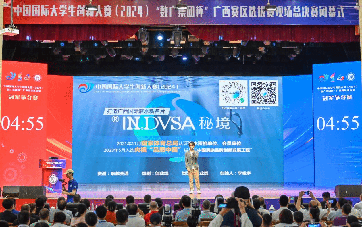 首页共有9个项目入围现场总决赛,7个项目获得金奖,5个项目入围金奖排位赛,数量位居高职高专院校前列。其中,艺术设计学院的《IN.DVSA秘境——打造广西国际潜水新名片》项目荣获职教赛道金奖排位赛第一名,并作为高职高专院校唯一代表与广西大学等5所本科院校角逐冠军。这是广西高职高专院校首次参与冠军争夺赛。