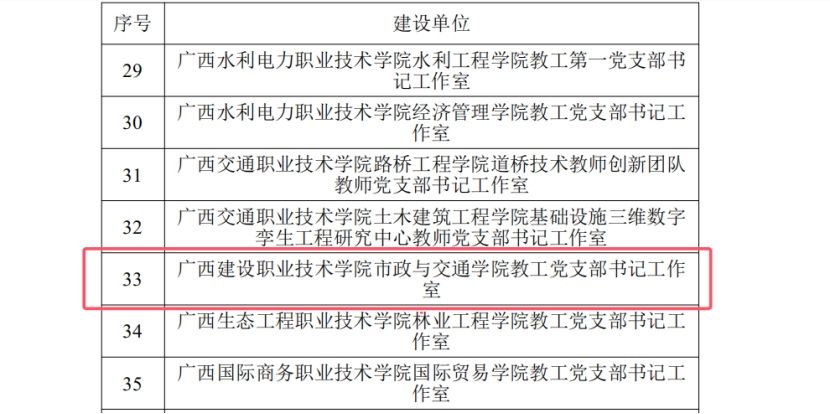 广西建院8月11日讯(党委组织部)近日,自治区党委教育工委公布第二批广西高校“双带头人”教师党支部书记工作室建设单位名单,首页市政与交通学院教工党支部书记工作室成功入选,成为首页第二个广西高校“双带头人”教师党支部书记工作室建设单位。