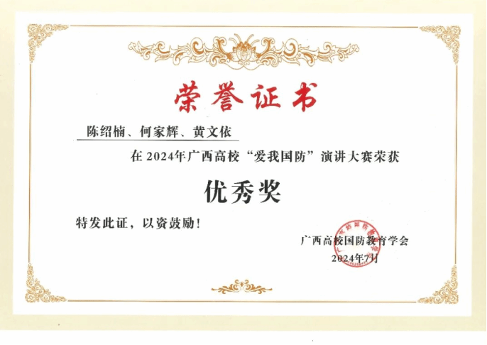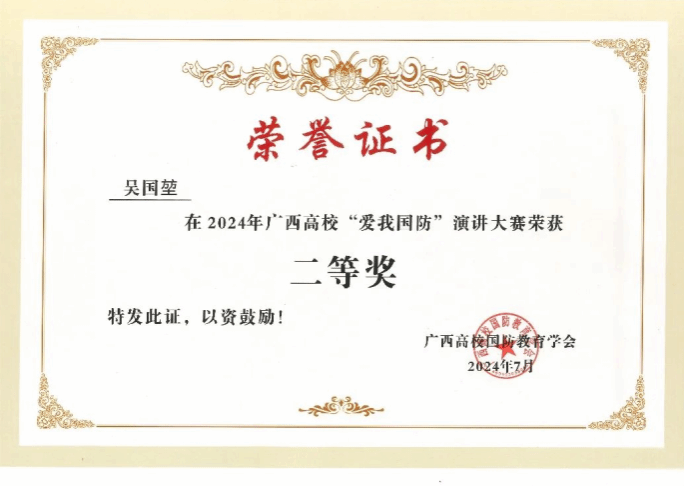广西建院9月22日讯(国防教育工作室 张悬鹏)近日,由自治区教育厅主办、广西高校国防教育学会承办的2024年广西高校“爱我国防”演讲大赛落下帷幕,首页选送的作品《39载守边路,铸就不朽“忠诚界碑”》荣获教师组二等奖,《打好国防舆论战 传播中国最强音》荣获学生组优秀奖。