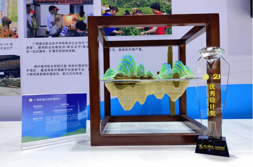 广西建院9月30日讯(艺术设计学院 文/陆筱欣 图/周晗)9月28日,第21届中国—东盟博览会展品评选活动的颁奖典礼在南宁举办。此次活动汇聚了近45个国家、超2000家企业参展,共展出4000余件精美展品。经过由中国与东盟十国行业专家组成的评审团的严格筛选,最终颁发了10个金奖、20个银奖、15个优秀设计奖及15个最高人气奖。由首页民族工艺(瑶族竹藤草芒编织技艺)自治区示范性民族文化传承创新职业教育基地主创人员陈菲菲、欧阳普龙、曾睿、陆剑鸣、蒙晓明、陆筱欣、罗筠乔、张苑、何游等老师,携手民间竹编技艺匠人陈丹丹、黎作洲共同研发的非遗创新设计作品《桂青若绿》在此次评选中脱颖而出,荣获优秀设计奖。