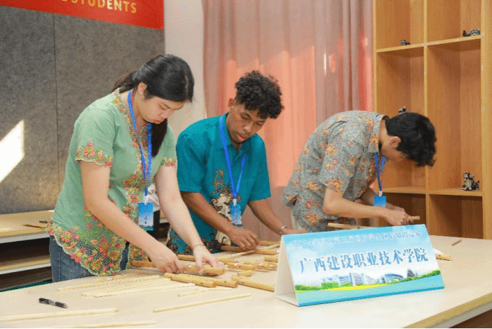 据悉,本届知识竞赛分为个人赛和团体赛,共有23所高校的69名留学生同台竞技。其中,个人赛由闭卷笔试和现场口头作文两部分组成,题目内容涉及中国以及广西政治、经济、历史、文化、风俗习惯等多方面的内容;团体赛以问答和实践形式进行,分为扎染、侗族木构、民族彩贴剪纸。最后,来自信息工程学院的胡恩瑄(DENISE HUSIANTO)同学和韩佑明(ALBERT GRACIOUS)同学获得个人赛三等奖;土木工程学院的杨自强(MANDASON YANCE ALAM WOILAND)同学获得个人赛优秀奖。首页代表队荣获团体赛三等奖。