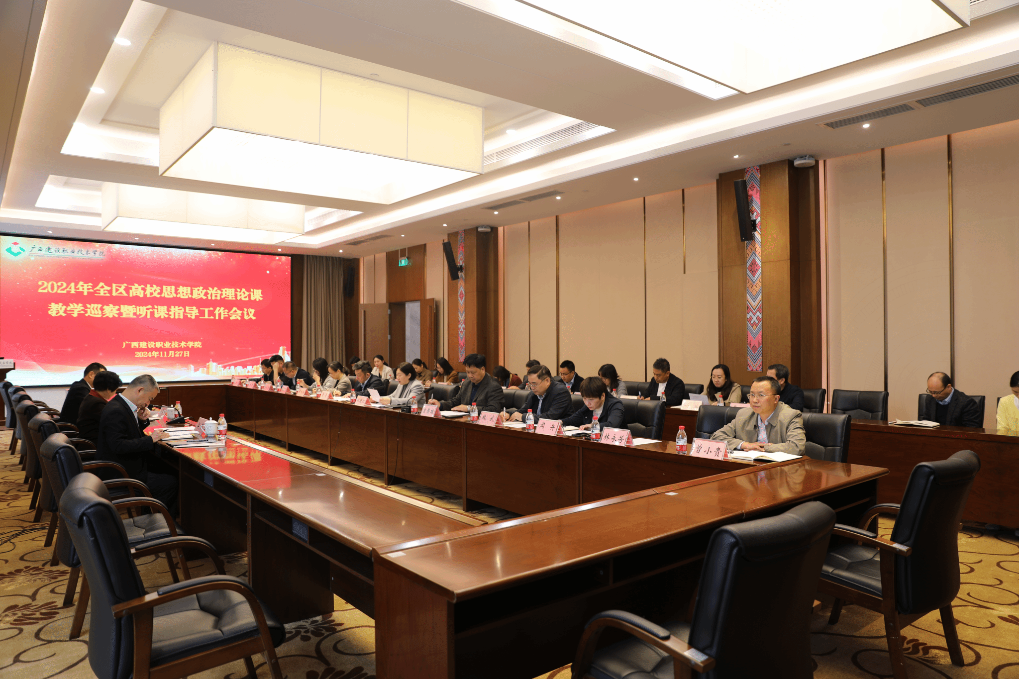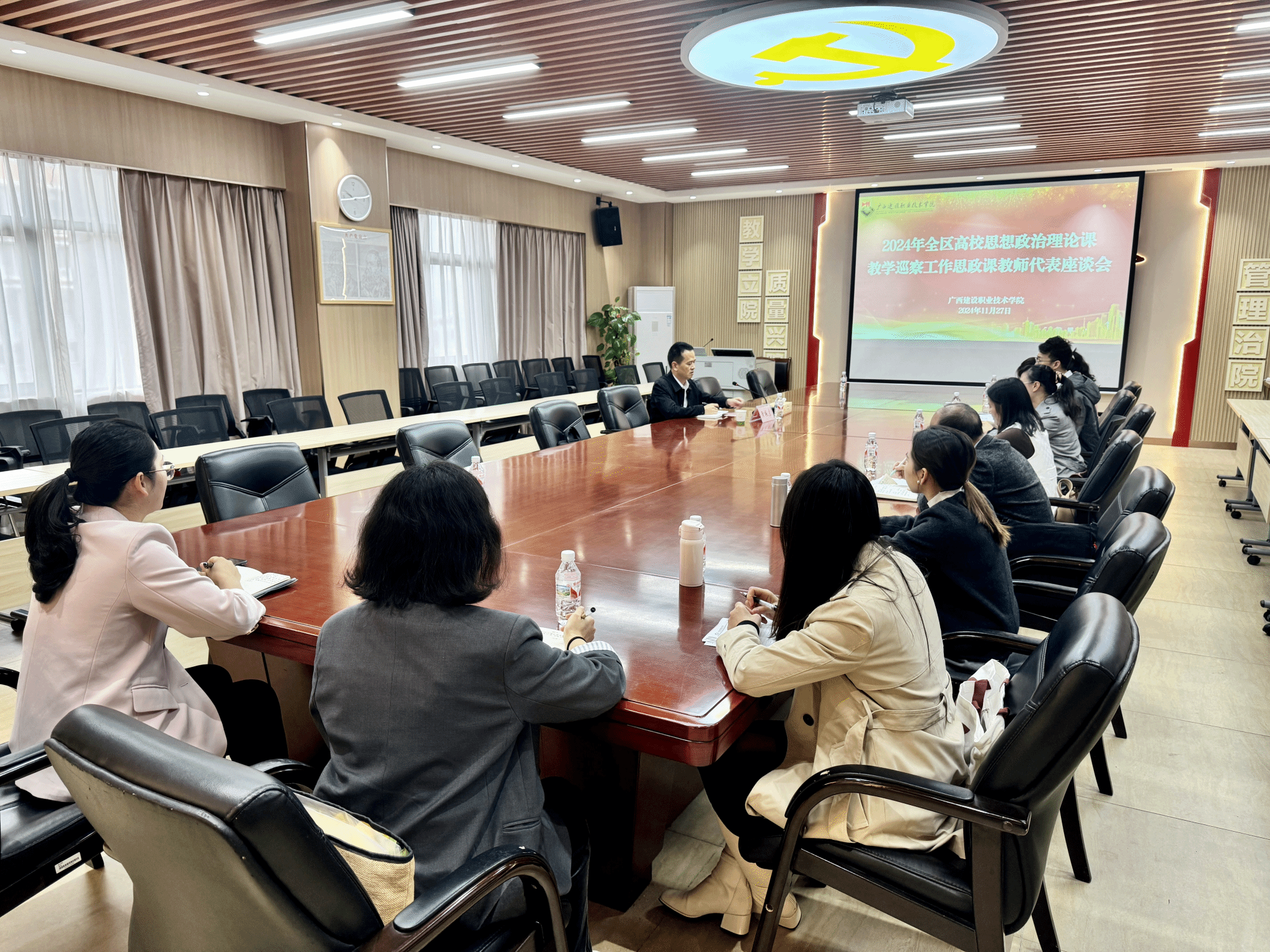 广西建院11月28日讯(文/宋佳雄 图/韦植巍 毕莉)11月27日,以广西中医药大学原副厅级调研员陈雪斌教授为组长,广西机电职业技术学院副校长、马克思主义学院院长黄振宣教授,广西信息职业技术学院马克思主义学院院长江颉教授为组员的全区高校思想政治理论课教学巡察暨听课指导专家组到首页开展思政课巡察指导工作。学校党委书记刘晓红、党委副书记曾繁雄、相关职能部门、各二级学院党政负责人以及马克思主义学院班子成员参加会议。