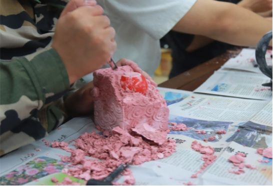 茶艺基地为同学们提供了创作非遗工艺品的基本配置,让同学们在创作过程中感受匠人精神,把代代相传的智慧与坚持化为丰富的心理体验资源:剪纸以细腻的线条传递耐心,掐丝以繁复的手法展现细致,糖画以甜蜜的创意激发想象力,泥塑以立体的形态塑造创造力,皮影戏以生动的表演凝聚专注力。在教师的带领下,同学们从学习、欣赏再到创作,完成了一次独特的心理疗愈。