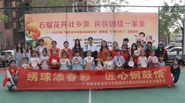 同时,学院团总支还积极拓展志愿服务领域,主动对接相贤社区,选派17名优秀志愿者参与社区2025年“铸牢中华民族共同体意识”教育暨“广西三月三”主题活动。志愿者们不仅帮助社区布置文化活动场地,还指导亲子绘制绣球纸盘画和制作手工铜鼓,他们的专业和热情态度赢得了社区居民的一致好评。