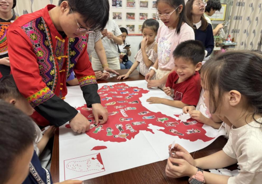 “衣脉相承”民族服饰变装活动中,身着各民族服饰的志愿者向居民细致讲解服饰特点与文化内涵。他们邀请居民参与“民族服饰贴纸互动”,将56个民族服装贴纸拼贴在中国地图上,以创意形式展现“中华民族一家亲”的深刻内涵。活动尾声,全体人员合唱《爱我中华》,激昂的歌声将民族团结的温情推向高潮。