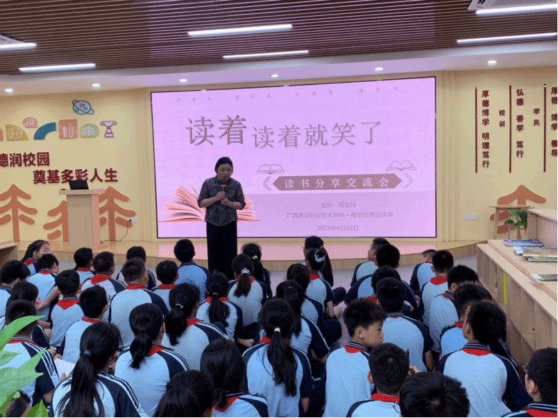 广西建院4月23日讯(图书馆 贺丽金)春和景明,书香满园。4月22日世界读书日前夕,首页阅读推广团队走进南宁市秀田小学,以“读着读着就笑了”为主题,为110名五、六年级学生带来了一场充满欢声笑语的阅读盛宴。
