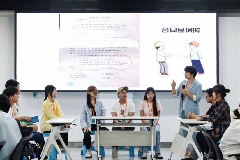 法庭模拟强化法律防护。“请大家明确各自角色,现在模拟庭审正式开始!”随着清脆的模拟法槌声响起,一场沉浸式法庭模拟课程拉开帷幕。针对学员普遍关注的“求职风险防范”类问题,培训班特别邀请廖国葵、卢春竹、简敏华等资深执业律师坐镇指导,精心搭建、高度还原模拟庭审场景。律师们将求职风险案例转化为实训剧本,带领学员完整演练法庭调查、举证质证、法庭辩论等庭审流程。每轮演练后,律师们细致解析求职中的权益边界与法律风险点,指导学员运用法律武器维护自身权益。这场“实战化”教学有效筑牢了学员的法律意识防线,为他们规避求职陷阱、保障职业权益装上了“防护盾”。