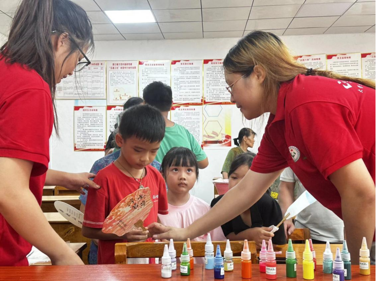 从调制漆扇颜料的耐心配比,到滴漆与搅拌,再到扇面漂染环节,团队师生耐心地指导大家发挥想象力,在扇面上绘制心中的家乡图景。整场活动欢声笑语不断,既锻炼了孩子们的动手能力,提升了他们色彩搭配的审美能力,又让漆扇这一非遗文化在瑶乡得到传播和推广。