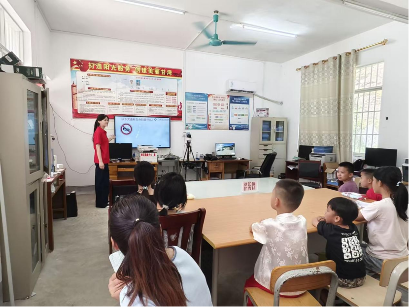 校地共话乡村振兴路径。实践团队以“科技文化进乡村 校地共筑振兴梦”为主题与甘湾村村委开展交流座谈。在甘湾村第一书记的介绍下,成员们了解了国家乡村振兴战略下基础设施的建设、乡村振兴等产业的相关情况。此外,团队还面向甘湾村村民和中小学生开展了交通安全与防震减灾专题宣讲活动。