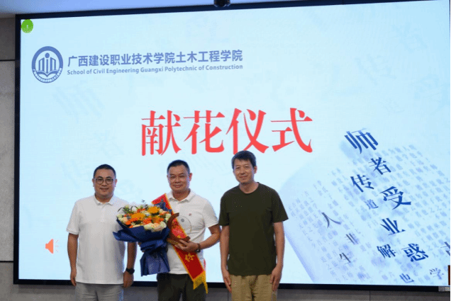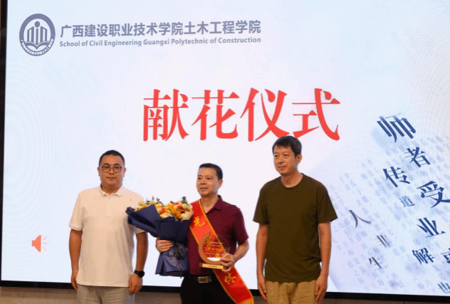 随后,学院领导为退休教师颁发荣休纪念品并献花,现场播放了记录四位老师教学生涯的回顾视频。一幕幕往事重现,从青丝到白发,从讲台到工地,他们用青春与智慧书写了土木人的教育情怀,令在场教师动容。