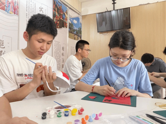 5月30日下午,工作室组织学生在二号公寓非遗展厅举办第26期“共话民传”微课堂非遗文化体验与展示活动,师生们齐聚一堂,共同开展竹编、香囊、侗族木构、糖画、泥塑、脸谱、剪纸等非遗体验活动,在手工制作中感受非遗文化并分享活动感悟。