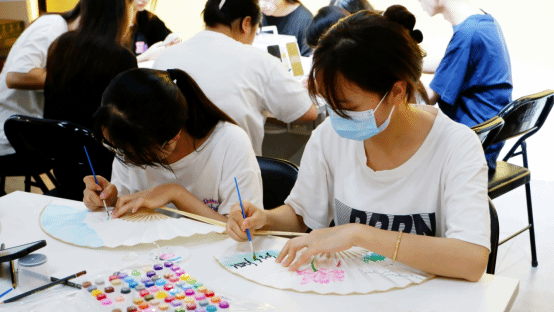 同学们以折扇为媒,手绘荷花