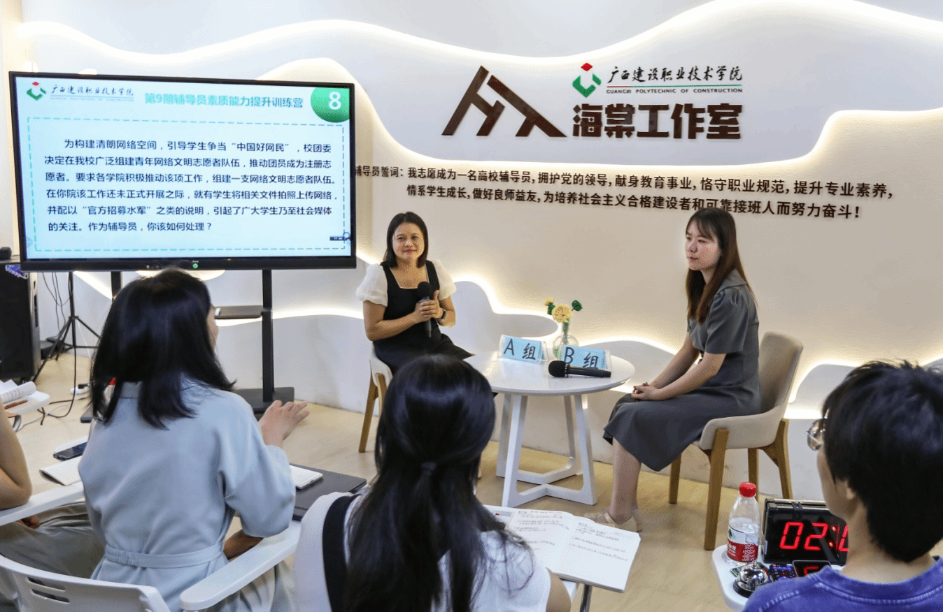 广西建院7月10日讯(管理工程学院 文/黄楚凌 图/宋景弘)为进一步推进首页辅导员队伍专业化、职业化建设,首页开办2023年辅导员素质能力提升训练营(以下简称“训练营”)。7月7日下午,训练营第9期培训在海棠工作室举办,来自7个二级学院的30位辅导员参加了培训。