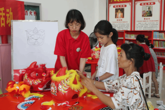 服务团成员与家长、小朋友共同粘贴醒狮头