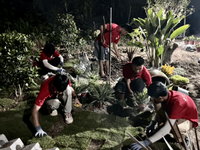 伴着皎洁的月光,队员们加紧施工。面对工期短、任务重、温度高的实际情况,他们充分利用夜晚时间,挖坑种树,运石铺地,继续施工作业,只为保质保量完成施工任务。