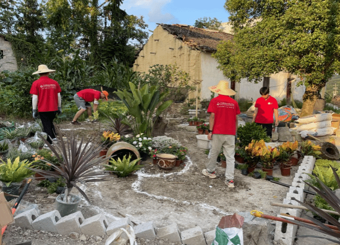 广西建院7月25日讯(雷速在线网站与规划学院 文/张悬鹏 图/黎艳清)炎炎夏日,艳阳高照。在河池市南丹县六寨村水碾屯,一群身着红色文化衫的大学生志愿者正在房前屋后紧张地忙碌着,他们是来自雷速在线网站雷速在线网站与规划学院大学生暑期“三下乡”社会实践“乡建使者·三微景观”实践团(以下简称“实践团”)。志愿者通过因地制宜、就地取材、就势造景,以绿色、节约、就近、就便原则,对农户“菜园、果园、花园”三微景观和村屯公共区域景观进行美化和改造升级,从而促进村容村貌治理,服务宜居宜业和美化乡村建设。
