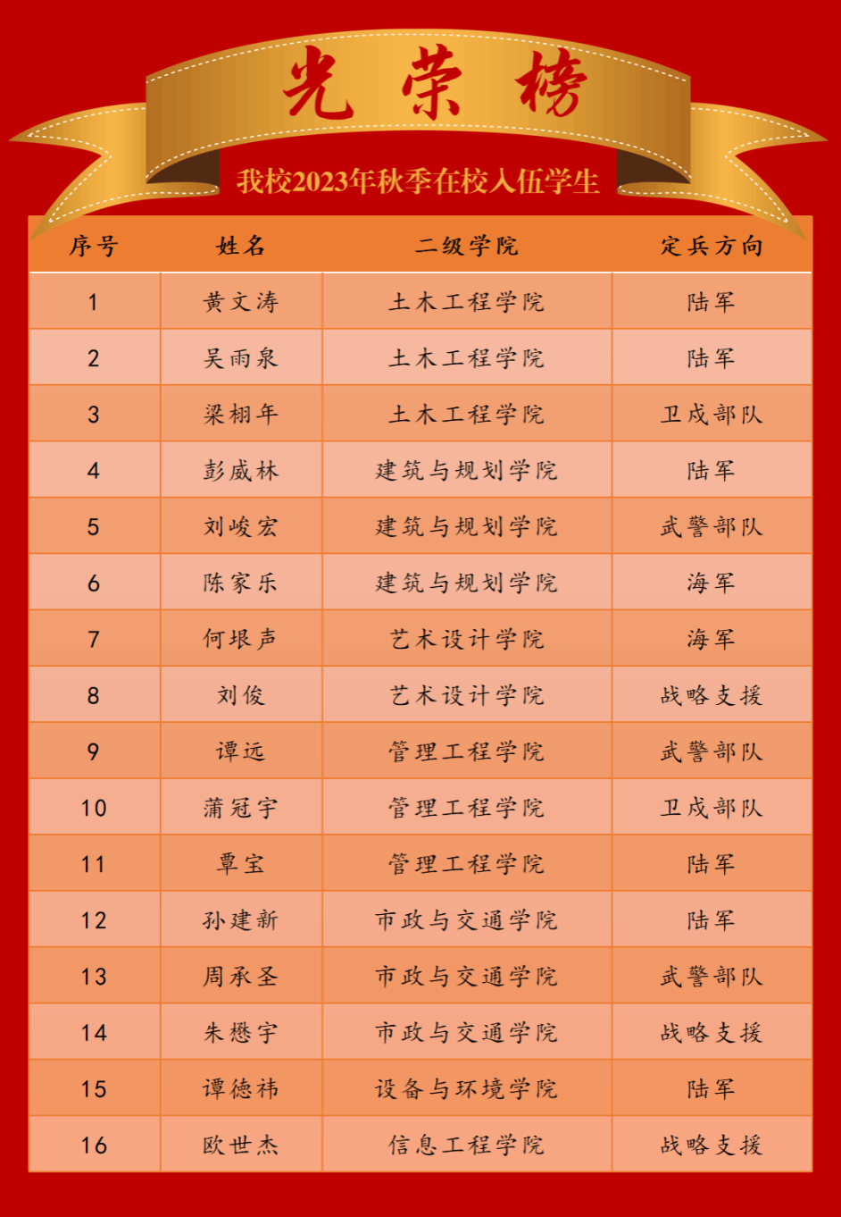 经过体格检查、政治考核、身体复查、役前教育训练等环节层层考核、严格选拔,最终首页共有16名在校应征学生被批准光荣入伍,成为中国人民解放军的一员。