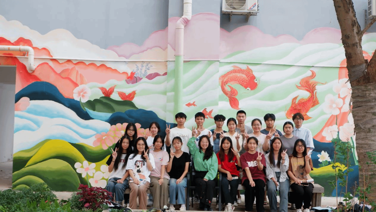 在绘制之前,工作室师生团队设计了四种墙绘效果图,并广泛征求了同学们的意见。在绘制过程中,不论是勾线稿、调色、上色,还是修饰细节,师生们始终专注投入,乐此不疲。团队中的许同学说:“虽然白天忙于上课,晚上又绘制墙画,日子过得忙碌又疲惫,但看到自己和小伙们一笔一画的努力,让校园生活环境变得更美了,就觉得非常有成就感,特别是当上完最后一笔的时候,一切的疲惫都一扫而空,满心都是欢喜与激动。”