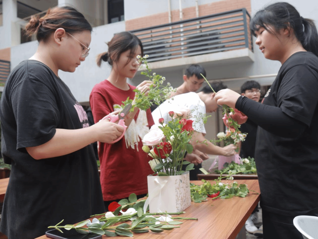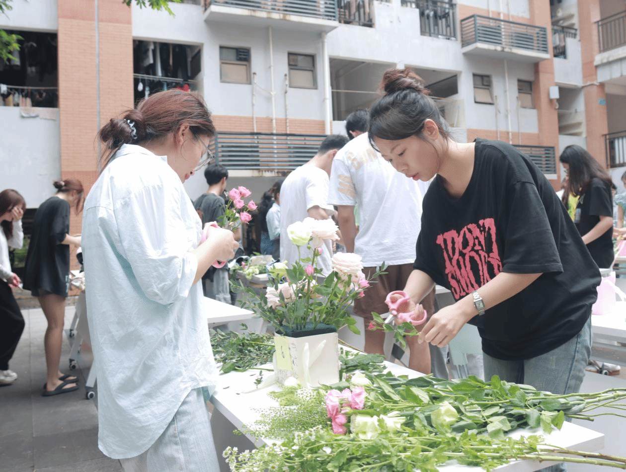 广西建院6月6日讯(管理工程学院 封炫妃)6月5日下午,学校茶艺文化传习基地联合学校宿管科开展学生社区“以花为友 拥抱生活”花艺大赛。活动共吸引了200余名学生分50组参赛。