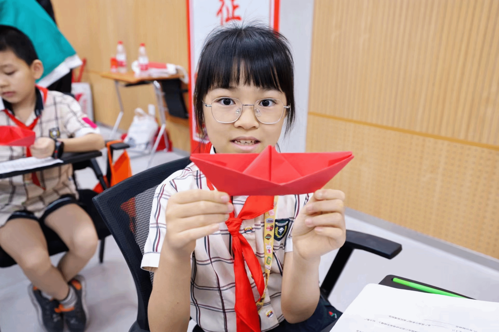 小朋友举起自己折叠的红船分享感悟
