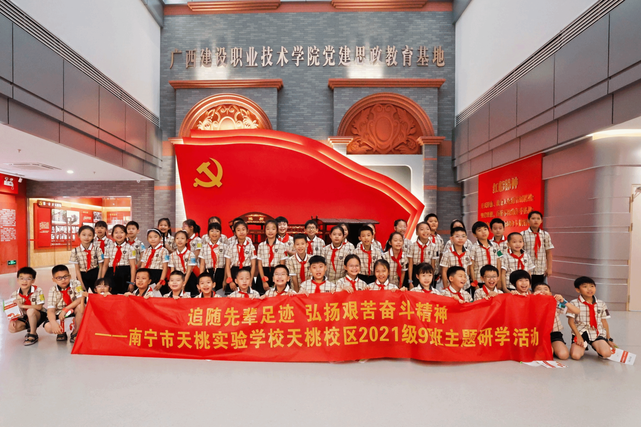 广西建院6月17日讯(马克思主义学院 甘麒燕 继续教育学院王慧淼)6月15日,广西建设职业技术学院党建思政教育基地迎来了天桃实验学校教育集团天桃校区2021级9班的49位小朋友。