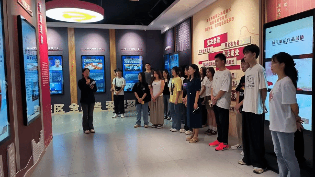 全体团员在讲解员的带领下,同学们参观了学校廉洁教育基地,学习基地主要展示的六大板块内容,深刻认识了党反腐败的决心,也了解了学校“清廉建院”的建设情况和全面从严治党情况,让同学们进一步认识到要知敬畏、存戒惧、守底线。