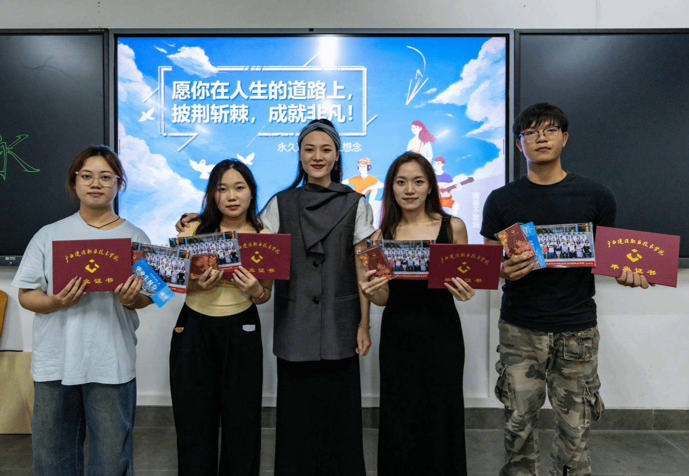 毕业生在签名墙前合影