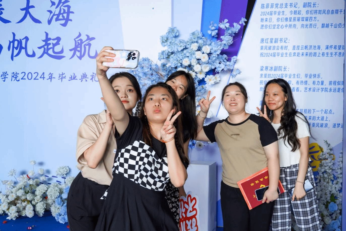沉浸体验,营造氛围。为使毕业生切实感受母校温暖,学院营造了浓厚的离校教育氛围,设置了毕业签名墙、暖心茶歇区、特色合影打卡区,为毕业生们提供照片拍摄、交流互动的空间。在一声声“咔嚓”中,一阵阵欢声笑语中,展现了毕业生们绚丽青春的魅力。