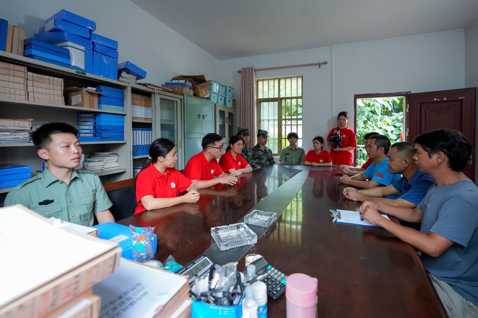 戍边楷模话国防,青年学子心中敬。实践团步行40分钟抵达尖峰岭哨所,见到了曾5次进京接受表彰的爱国戍边楷模—陆兰军,他一家三代4口人为国守疆45年的事迹被广泛宣扬。在陆兰军和现任哨长闭正法的介绍下,实践团成员们了解了哨所的历史和重要意义,聆听了戍边光荣事迹,共同回忆了那段峥嵘岁月。大家还穿过工事见到了“猫耳洞”,站在哨岗前观察国境线,真正体验了一次“哨兵”经历。“对面的山峰,就是当时自卫还击战‘高巴岭战役’的主战场。” 陆兰军指着远处的山峰说道。通过走访,实践团成员们深深地感受到,今天祥和安宁的边境线是军民同心、英勇奋战换来的,要倍加珍惜。期间,实践团向哨所赠送了象征和平与友谊的幸福之树。