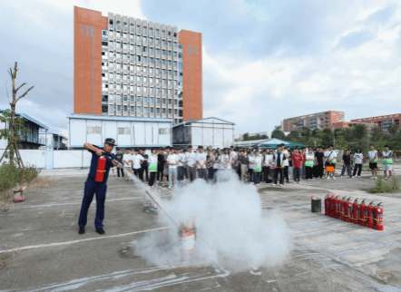 学生们现场进行消防灭火器的实际操作